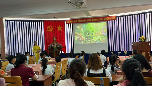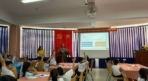 Tiết học diễn ra trong không gian lớp học thân thiện, nơi học sinh vừa hồi hộp vừa háo hức khi có ba mẹ và các thầy cô ngồi phía sau cùng quan sát. Ngay từ phần khởi động, học sinh rất hứng thú khi được tham gia trò chơi minigame trực tuyến mang tên “ Đại lễ tìm vua”. Không khí lớp học trở nên sôi nổi, vui tươi, giúp học sinh bước vào bài học với tâm thế tự tin, thoải mái dù có phụ huynh đang tham dự. Không chỉ vậy, học sinh còn được tạo bất ngờ bởi “Người bạn đến từ thiên nhiên” – trợ lý AI đồng hành mang tên “Lá xanh”.